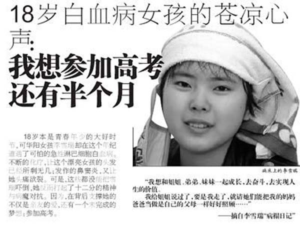 4月中旬,雪瑞堅持回到學(xué)校上課,第二天就暈倒在課堂上。隨后一個噩耗襲來:雪瑞患的是急性淋巴細(xì)胞白血??! 她失去了上大學(xué)的機會,也再次改變了她整個家庭,全家人再次陷入痛苦的深淵。