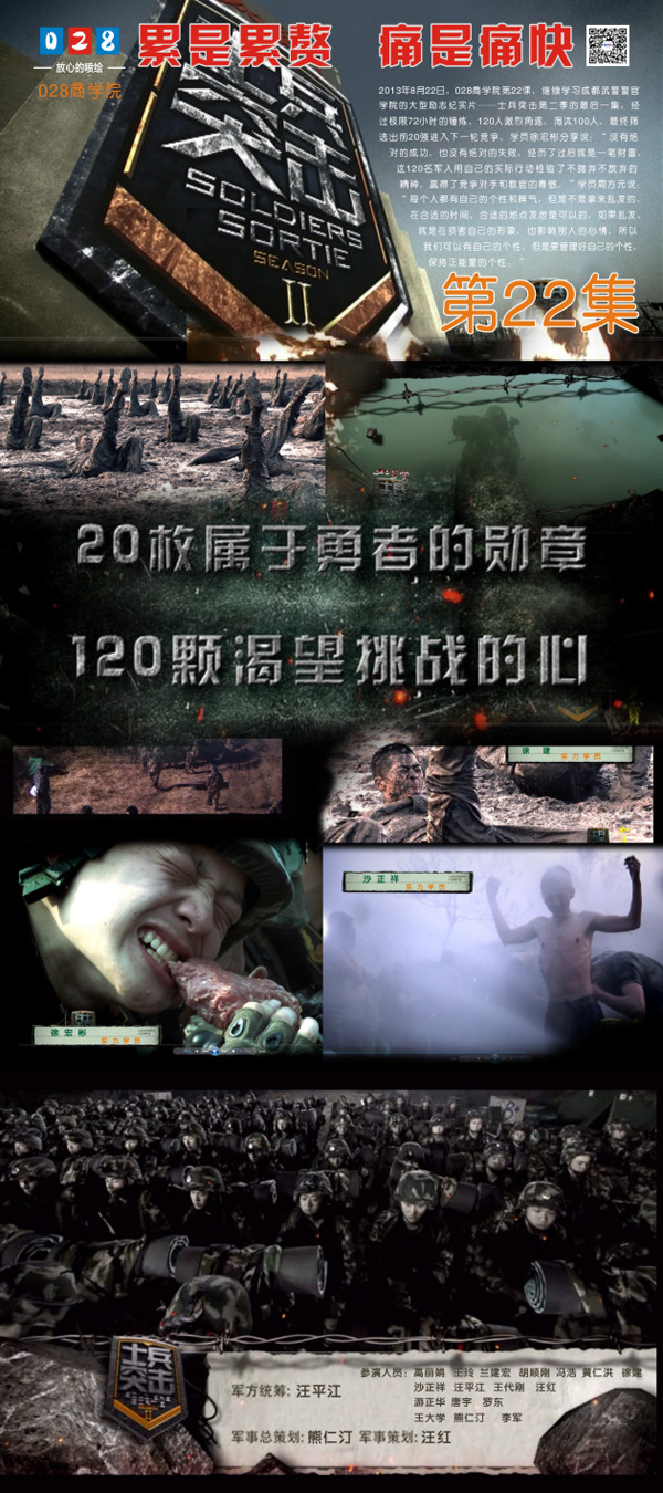 2013年8月22日,成都吸塑字廠028商學院第22課,繼續(xù)學習成都武警警官學院的大型勵志紀實片——士兵突擊第二季的最后一集,經過極限72小時的錘煉,120人激烈角逐,淘汰100人,最終篩選出前20強進入下一輪競爭。營銷部學員徐宏彬分享說:“沒有絕對的成功,也沒有絕對的失敗,經歷了過后就是一筆財富,這120名軍人用自己的實際行動檢驗了不拋棄不放棄的精神,贏得了競爭對手和教官的尊敬。”學員周方元說:“每個人都有自己的個性和脾氣,但是不是拿來亂發(fā)的,在合適的時間,合適的地點發(fā)泄是可以的,如果亂發(fā),就是在損害自己的形象,也影響別人的心情,所以我們可以有自己的個性,但是要管理好自己的個性,保持正能量的個性?!?nbsp;