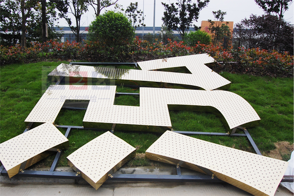 LED外露燈發(fā)光大字則是在金屬板上沖好孔,然后再用激光切割成型,最后焊接成字形,裝燈。固定在鋼架上完成。