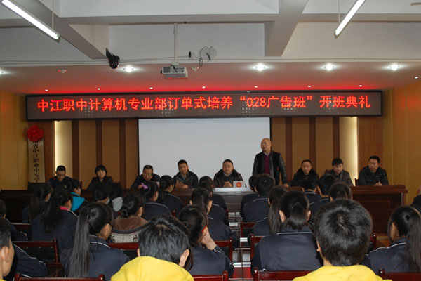 2014年12月28號,四川零貳捌廣告有限公司汪總經(jīng)理一行人到中江職中參加了“零貳捌廣告訂單班”開班儀式。同學(xué)校制定針對企業(yè)崗位需求的培養(yǎng)目標(biāo)、共同組織教學(xué)等合作。當(dāng)天為中江職中計算機專業(yè)部的同學(xué)進(jìn)行了實戰(zhàn)培訓(xùn),為學(xué)生到公司就業(yè),發(fā)展加厚基礎(chǔ)。