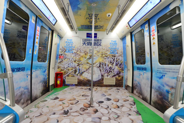 以“公園城市首提地——天府新區(qū)”為主題的“公園城市號(hào)”專列在地鐵1號(hào)線驚艷亮相。走進(jìn)車廂內(nèi),移步換景,石子路、綠蔭、山水、建筑…一座高顏值、生活味、國際范、有歸屬感的美麗宜居公園城市場景躍然眼前。興隆湖濕地公園、天府總部商務(wù)區(qū)、成都科學(xué)城、天府文創(chuàng)城……乘坐這列“天府新區(qū)·公園城市號(hào)”地鐵,帶你“游遍”天府新區(qū)!