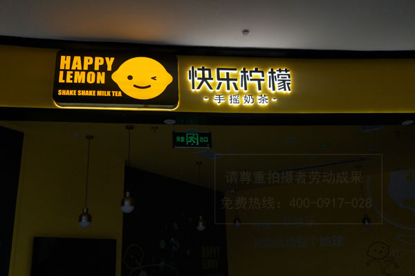 并且門頭不合適做的太花、太亂,用一個主色彩把本人的品牌嵌入進去即可,如快樂檸檬奶茶店主色調采用的就是檸檬黃,如今的群眾審美傾向簡約化。門頭還有告知消費者的作用,要讓人看到的第一眼就曉得這是一家飲品店,所以在設計時最好有飲品的元素。