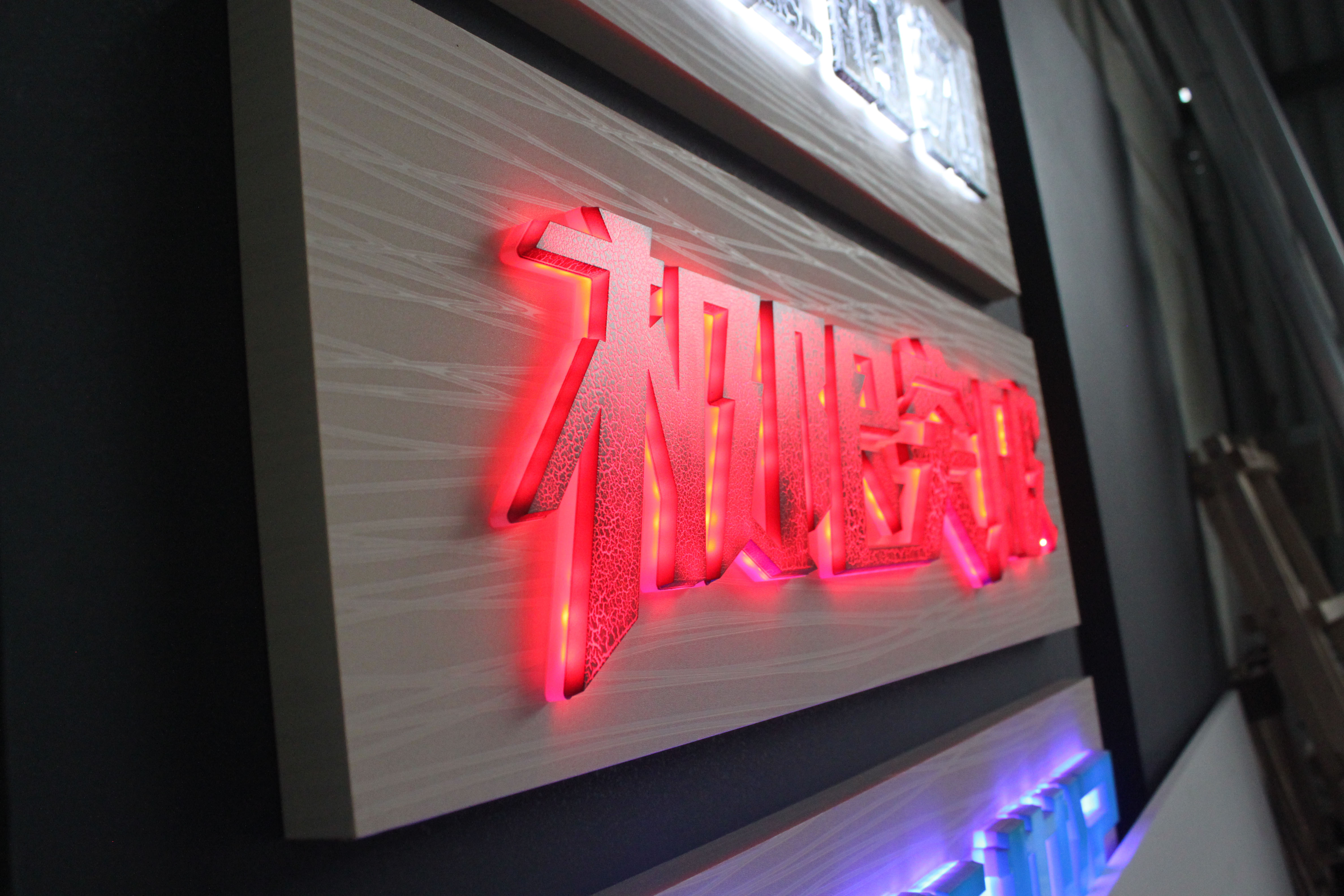 不銹鋼發(fā)光字,立體感強,內(nèi)嵌LED光源,使用激光切割而成,然后經(jīng)過打磨、上色、拋光的工藝之后成型的不銹鋼發(fā)光字。