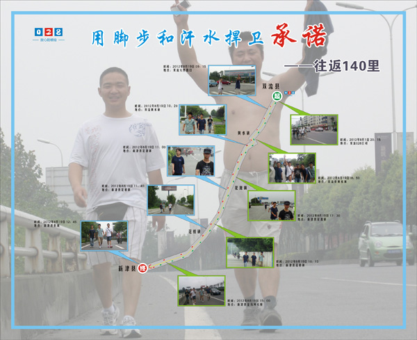 雙流到新津,往返140里路程,他們從早上8:30出發(fā),中午12:50到達新津,下午14:20出發(fā),晚上19:30回到公司,全身濕透了,有的人腳都走得腫脹起來,腿都有點僵直了,9小時30分鐘徒步走完140里路的過程無疑是艱辛的,但內(nèi)心是欣慰的,因為我們兌現(xiàn)了自己的承諾,這是無價而光榮的。