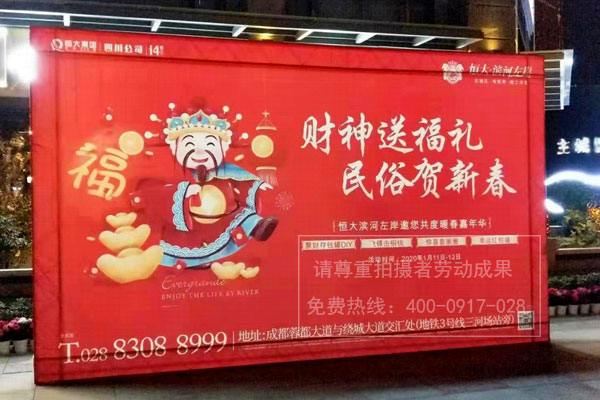 “財神送福禮,民俗賀新春”恒大濱河左岸樓盤桁架廣告制作安裝