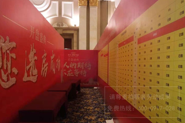 恒大地產(chǎn)御景半島開盤盛典算價(jià)區(qū)背景墻桁架搭建/路欄噴繪畫面制作安裝