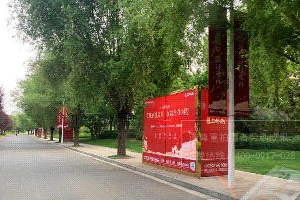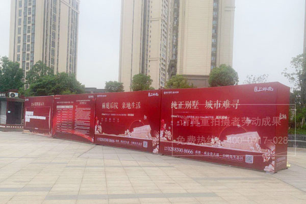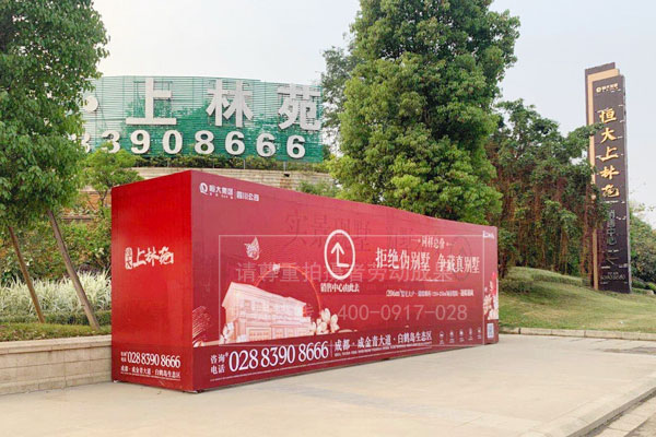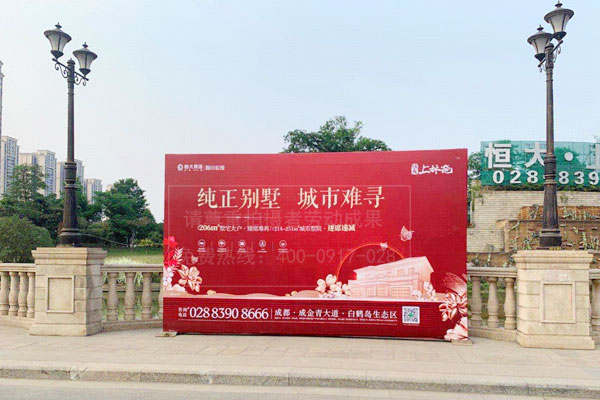 成都房地產(chǎn)廣告公司為您展示我們?yōu)楹愦蟮禺a(chǎn)上林苑樓盤項目制作安裝的戶外宣傳廣告物料現(xiàn)場照片,包括圍墻圍擋噴繪、燈桿道旗、桁架廣告牌等。