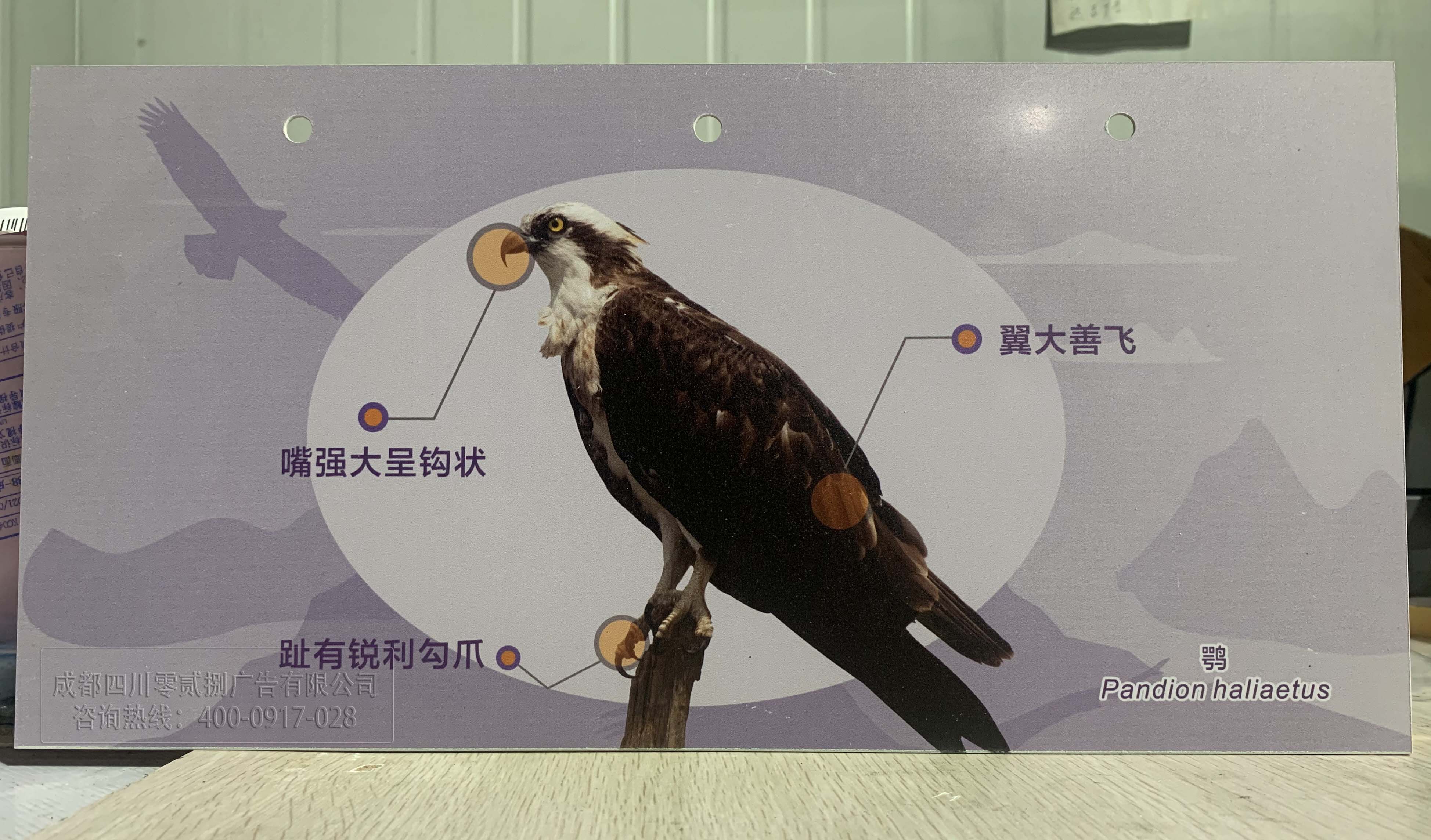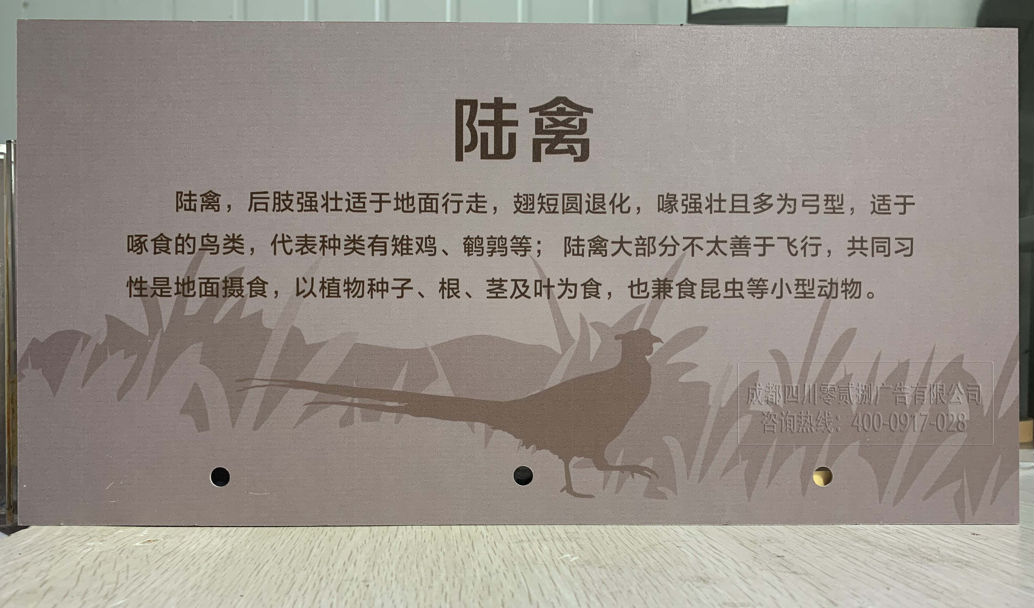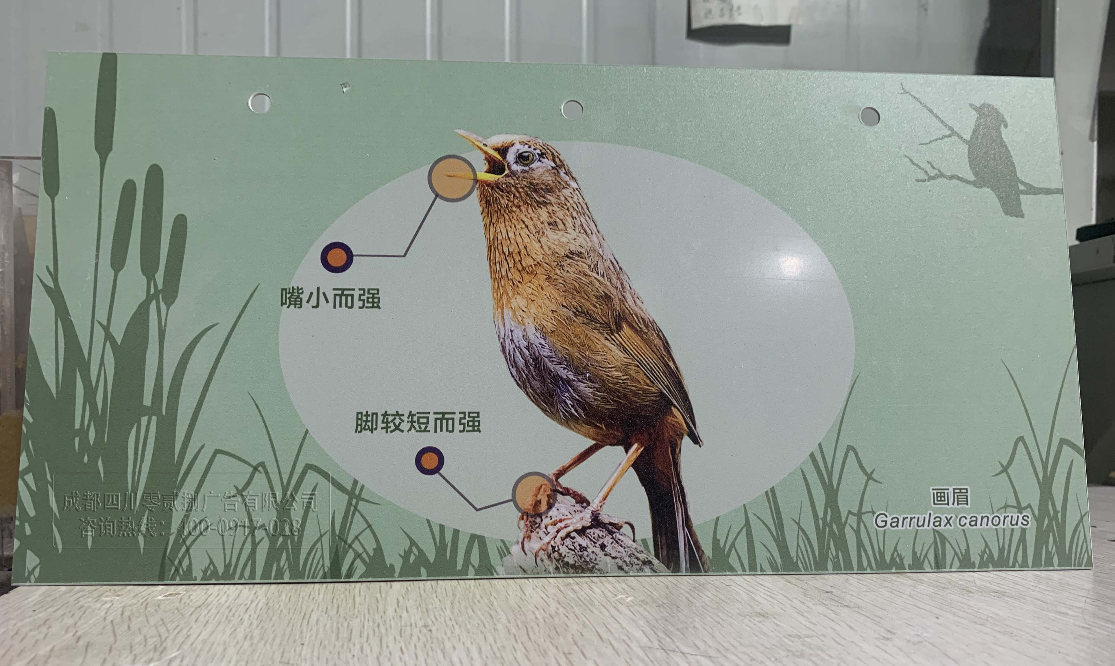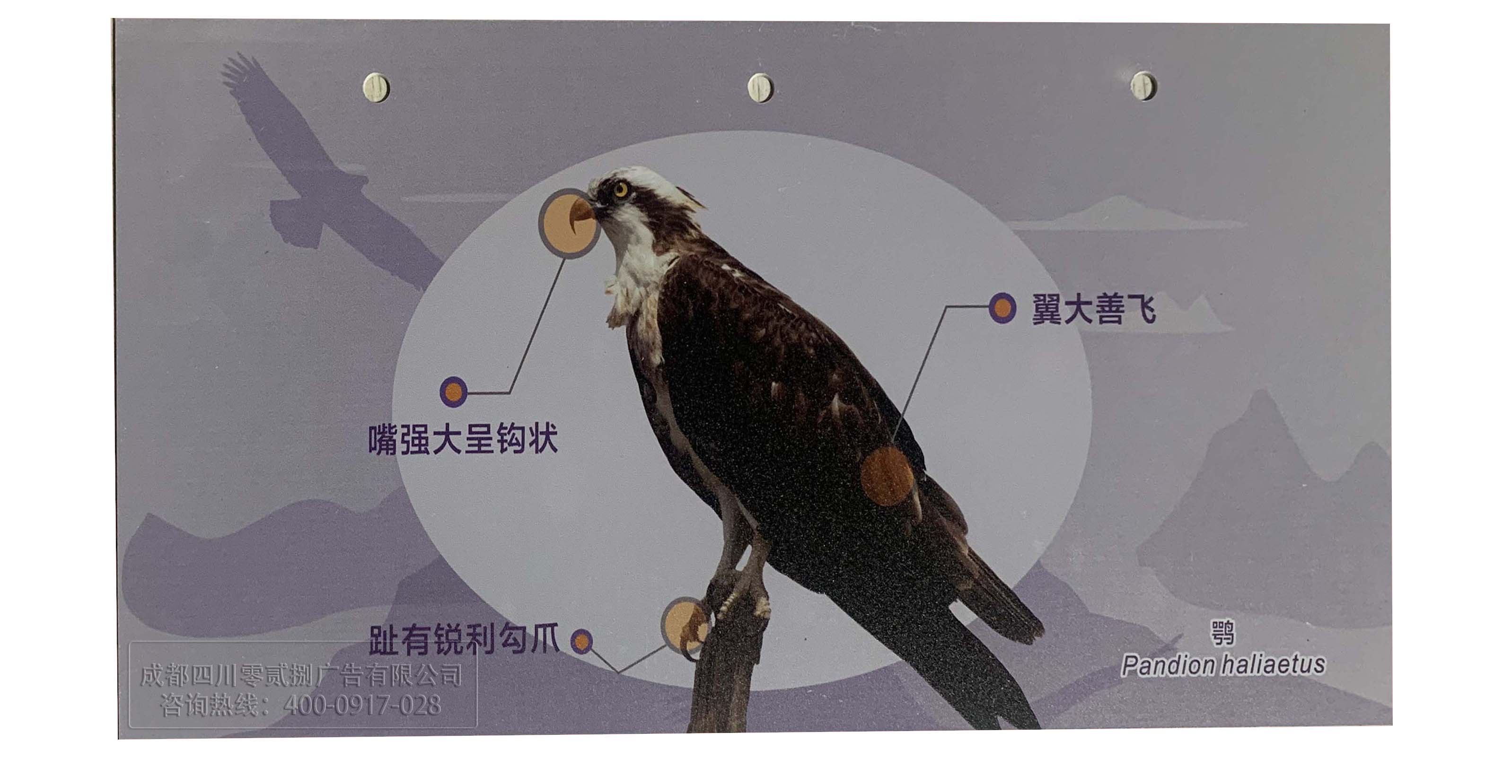 圖片為028廣告公司加工而成,由圖可見(jiàn)介紹鳥(niǎo)兒的知識(shí),雙色板色彩更立體,活靈活現(xiàn),適合展覽等場(chǎng)合平面雙色板展示。打孔適合固定不影響整體效果。