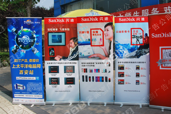 易拉寶規(guī)格尺寸的認(rèn)識 易拉寶或稱海報架、展示架,廣告行業(yè)內(nèi)也叫易拉架、易拉得、易拉卷等,是樹立式宣傳海報。常見于人流多的街頭通道,協(xié)助個體戶式的路演推銷活動,或是臨時攤位。易拉寶主要質(zhì)料是塑膠或鋁合金。和易拉寶用法相似的宣傳產(chǎn)品是刀旗、海報、X展架等。