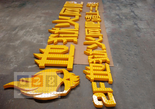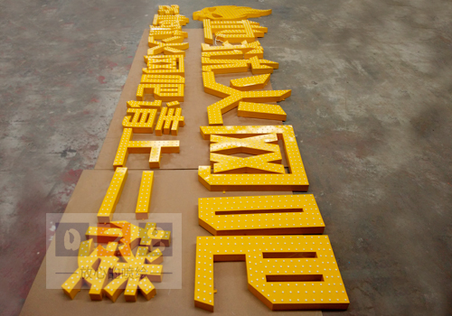 鐵皮烤漆外露發(fā)光字是在表面沖孔安裝上LED單顆防水燈串,制作外露發(fā)光字(也叫穿孔字)的材料有很多如:亞克力、鍍鋅板、不銹鋼、鈦金板等,這里我們主要講述的是鐵皮烤漆外露發(fā)光字,下面簡單講述一下外露發(fā)光字(
