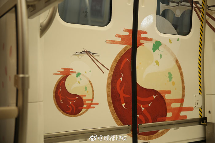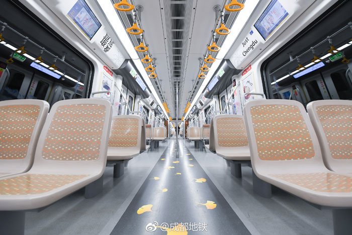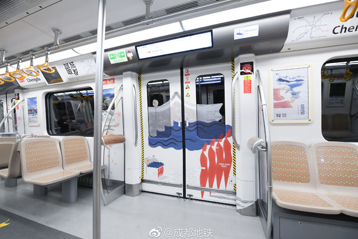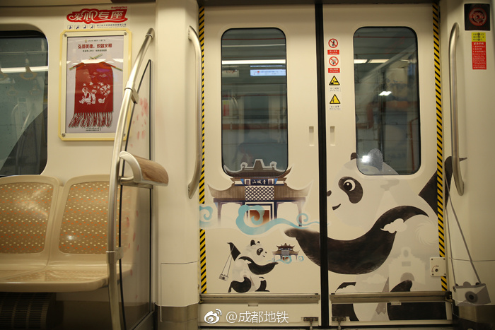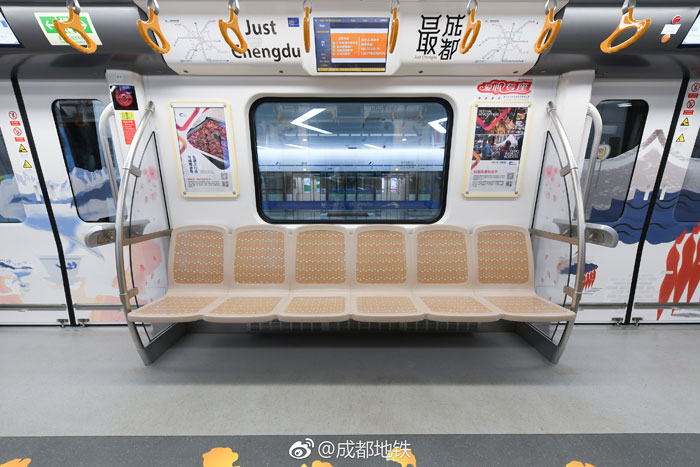 成都的美景、美食名揚四海,早已成為這座幸福之城的溫暖標識。成都軌道集團邀請國內(nèi)知名設(shè)計公司以“在路上行走,為成都停留”為主題打造“最成都”號,深入挖掘成都旅游及飲食文化資源,精心提煉出“大熊貓與青城山”、“火鍋與廊橋”、“蓋碗茶與西嶺雪山”、“辣妹子與寬窄巷子”等標志性元素并進行創(chuàng)新融合、藝術(shù)點睛,形成4幅風格清新、簡潔明快的“最成都”主題圖案,貫穿于車體、車門、車廂墻面等處,再配上隨車搖曳的銀杏葉形狀拉手、散落在座椅間的芙蓉花貼及特制古風畫框,由內(nèi)至外營造出最具成都韻味的主題列車。