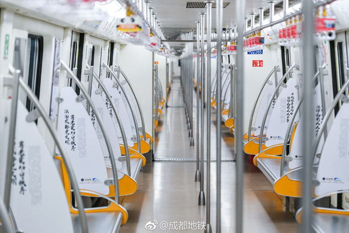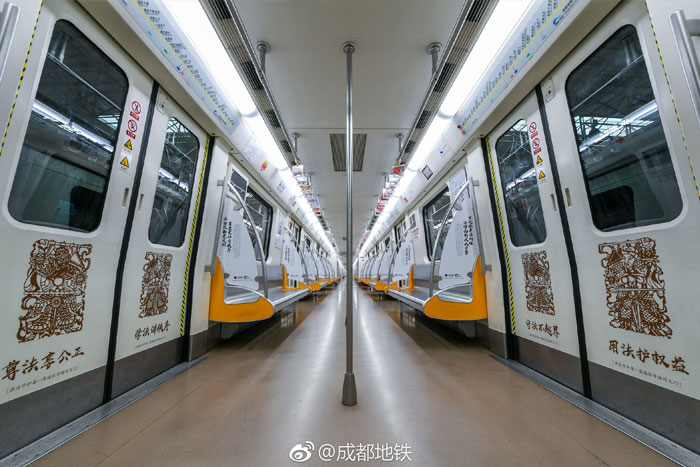 步入成都地鐵“法治號”主題列車車廂,地鐵車門處以中國非物質(zhì)文化遺產(chǎn)——剪紙創(chuàng)作的門神,分列車門兩邊,生動詮釋了“法治守護(hù)每一扇通往幸福的大門”的深刻含義,讓市民乘客真正理解“尊法享公正,學(xué)法講秩序”、“守法不越界,用法護(hù)權(quán)益”的法治精神。而在列車座位處,“無論你身居何位,法律面前人人平等”“尊老愛幼守秩序,法治成都更文明”等宣傳貼畫,一語點破法治要義,號召市民共同維護(hù)法治文化氛圍。