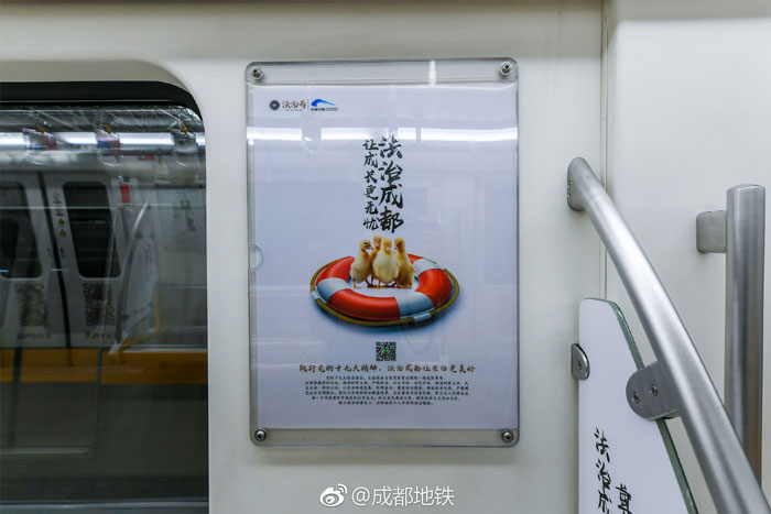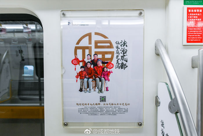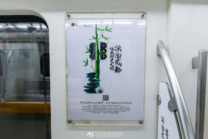 列車車廂首先映入眼簾的是一幅幅簡潔明快的創(chuàng)意海報:以竹子隱喻做君子守法,紅綠燈寓意出行,詮釋“法治成都,讓出行更文明” ;用美滿的家庭、溫暖的笑臉、“?!弊譃樵兀忈尅胺ㄖ纬啥?,讓家庭更美滿”;以竹子做成的傘為國寶大熊貓遮風(fēng)擋雨,讓大熊貓健康成長,巧妙詮釋“法治成都,讓環(huán)境更秀美”的內(nèi)涵,以入腦入心的方式向市民乘客傳遞法治與民生息息相關(guān),法治就在身邊的觀念。