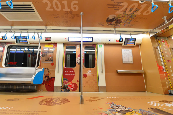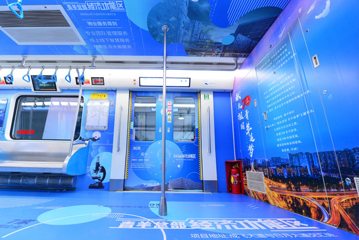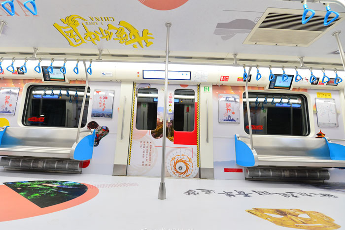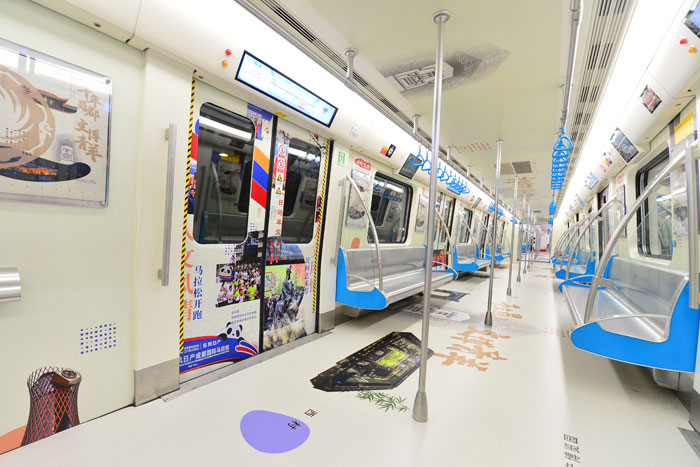 “青羊追夢(mèng)號(hào)”列車,前三節(jié)車廂,就能感受到青羊區(qū)作為四川首批天府旅游名縣的底氣。漫步車間,腳下是太陽(yáng)神鳥金箔、金沙遺址金面具、神獸石犀、蜀錦……這些是歷史留下的寶貴印記。再往前走,便是杜甫草堂、寬窄巷子、西村、成都國(guó)際非物質(zhì)文化遺產(chǎn)博覽園……都是有著千年蜀都韻味的成都標(biāo)志性景點(diǎn),是游客們必來的網(wǎng)紅打卡地。第四節(jié)車廂為非遺主題車廂,古色古香的畫風(fēng)、厚重的歷史韻味的畫面,在這里能看到歷屆國(guó)際非物質(zhì)文化遺產(chǎn)節(jié)盛況。其中,在車門區(qū)域,設(shè)計(jì)有成都“四大名旦”的精致畫面,包括有瓷胎竹編、蜀繡、漆器、銀花絲。