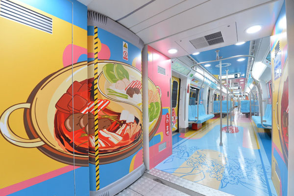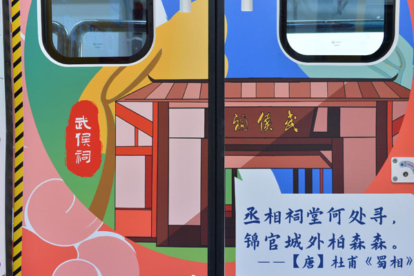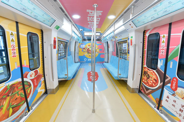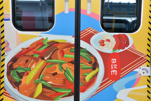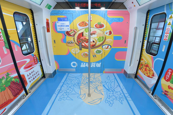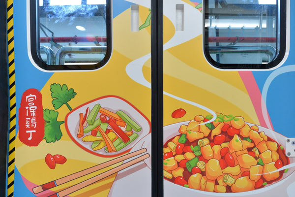 來(lái)啦!城市文化主題,將8節(jié)車廂劃分成蜀址、蜀遺、蜀樂(lè)、蜀味4大板塊,成都軌道交通17號(hào)線主題列車旨在展示成都悠久的城市歷史和多彩的民俗文化?;疱仭⒒劐伻?、麻婆豆腐宮保雞丁…感覺(jué)會(huì)越坐越餓