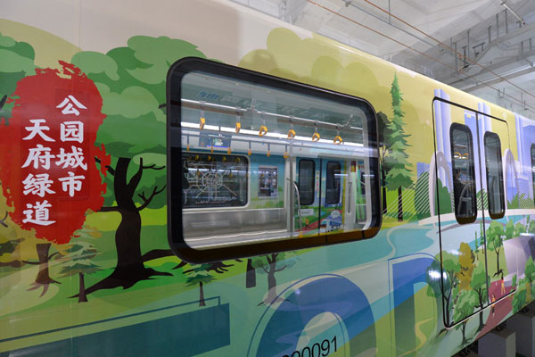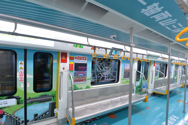 成都地鐵9號線主題列車來了!圍繞“一軸”、“兩山”、“三環(huán)”、“七道”4大主題,成都軌道交通9號線主題列車以8節(jié)車廂為舞臺,全景式地描繪了成都美麗宜居公園城市的建設愿景。每節(jié)車廂分別用“金絲猴、華南虎、大熊貓、金錢豹”作為重要特色標志,充滿新意、奇趣。