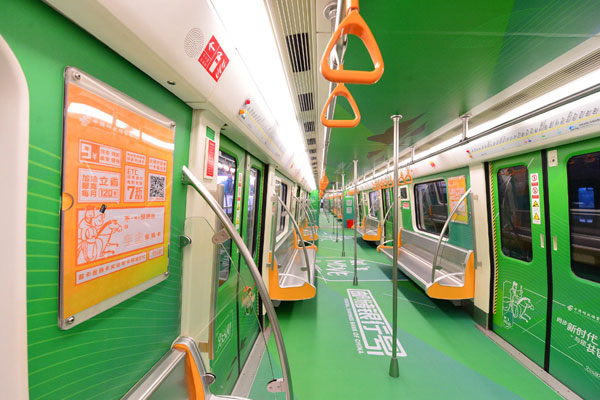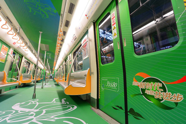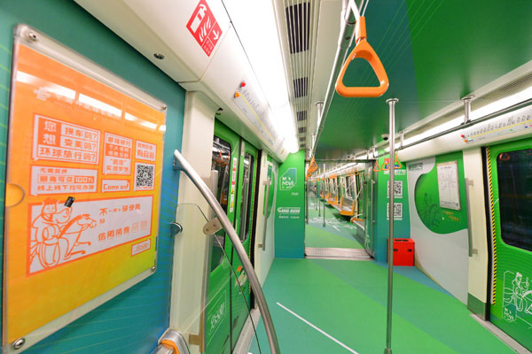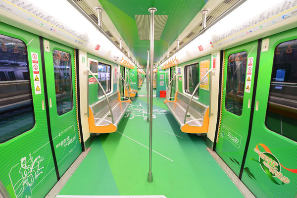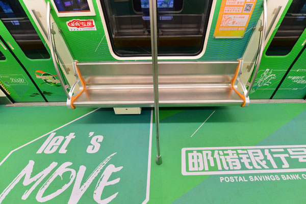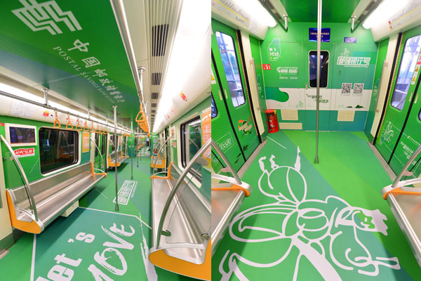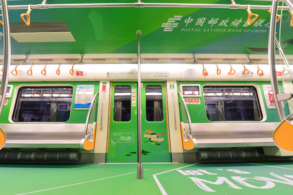 成都地鐵2號線有了一列“綠色”班列,這是郵儲銀行四川省分行為慶祝新中國成立70周年,和成都地鐵合作開行的“郵儲銀行號”主題列車,乘客們可以在地鐵2號線上感受到“滿目的綠,清新爽心”的美景。