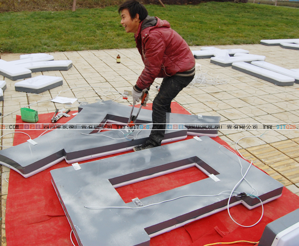 安裝工人正在對(duì)吸塑字進(jìn)行排線工作